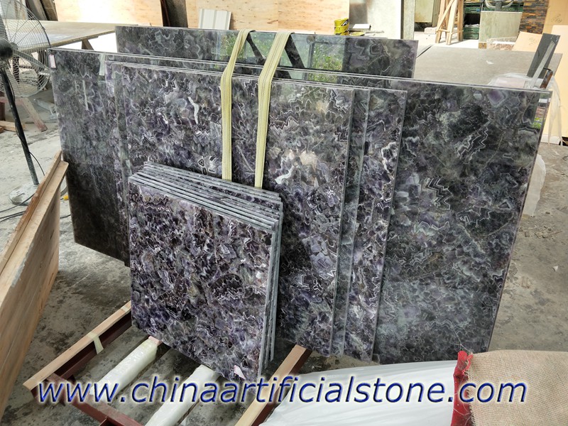 Amtheyst tiles or slabs can be Solid material or Laminated with Tempered Glass, Granite or Aluminum are available. Thickness 2cm for solid material. Laminated with glass is 3-5mm+15mm glass.